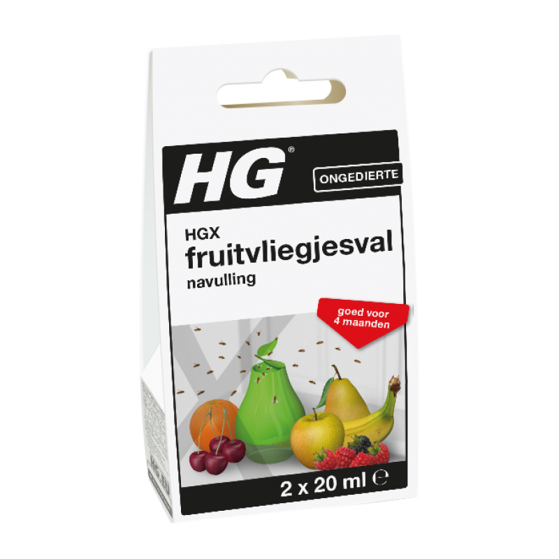 voor de Hg fruitvliegjesval. De HG fruitvliegjesval kan eenvoudig en onbeperkt worden nagevuld met de HG fruitvliegjesval navulling. Hierin zit een speciale fruitvliegjesval-vloeistof waardoor de fruitvliegjes worden aangetrokken.