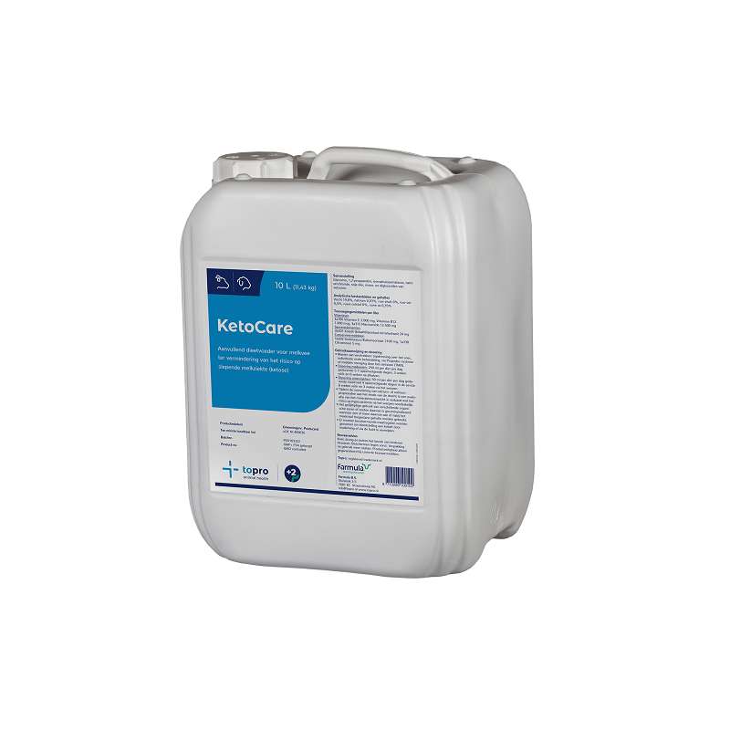 Topro KetoCare is een energierijk product bestaande uit de voedermiddelen propyleenglycol, glycerol en isomaltulosemelasse. Zowel glycerol als isomaltulosemelasse zijn beide erg smakelijk, waar propyleenglycol erg bitter is, en maken dat het zonder problemen wordt opgenomen. Daarnaast vullen beide voedermiddelen het aandeel propyleenglycol goed aan omdat ze minder snel beschikbaar komen voor het dier. Met name isomaltulosemelasse is een voedermiddel die langzamer vrijkomt. Hierdoor voorziet het de koe over een langere periode van energie.